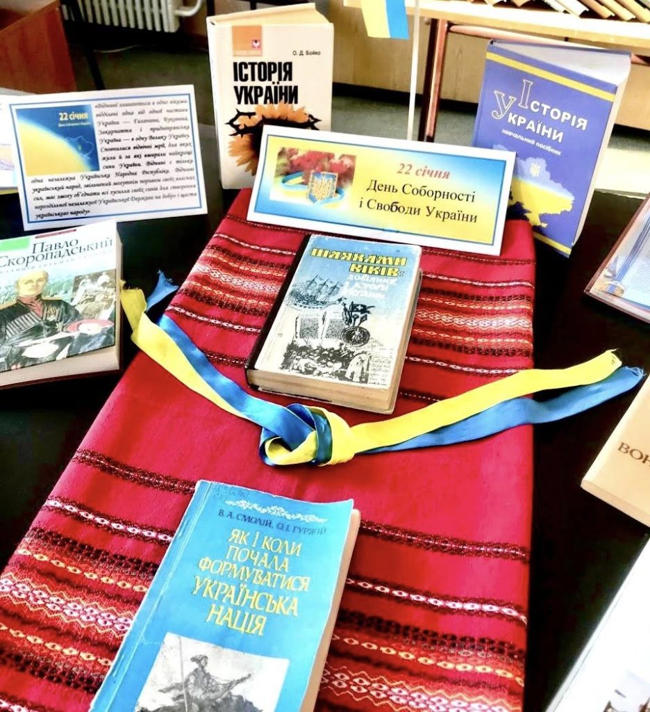 Завідувачем бібліотеки оформлено тематичну виставку «Соборна Україна — спільна доля», яка знайомить здобувачів освіти з історичними подіями, видатними постатями та документами, що утверджують державність України.