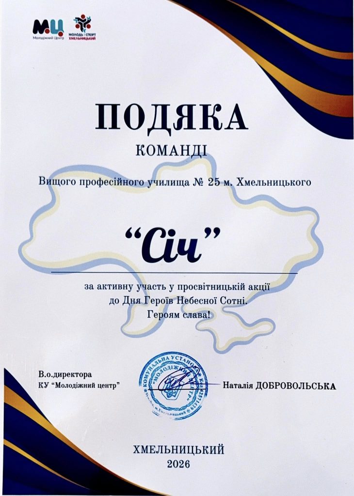 16 лютого, у День єднання, здобувачі освіти групи №22 разом із класним керівником Любов’ю Пархомюк долучилися до просвітницької акції з нагоди Дня Героїв Небесної Сотні, організованої комунальною установою «Молодіжний центр».