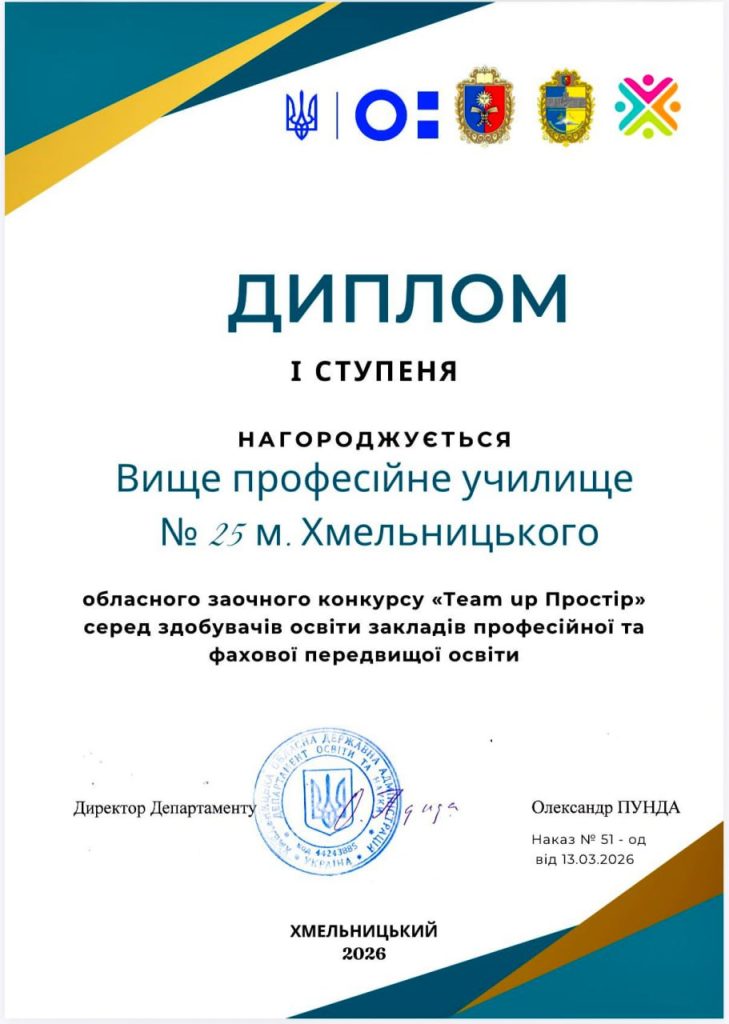 За підсумками обласного заочного конкурсу «TEAM UP ПРОСТІР» команда Вищого професійного училища №25 м. Хмельницького здобула Диплом І ступеня. Це вагоме досягнення є результатом наполегливої праці, креативності та відповідального ставлення до розвитку студентського самоврядування. Здобувачі освіти закладу вкотре продемонстрували високий рівень ініціативності, здатність генерувати сучасні ідеї та готовність бути активними учасниками позитивних змін. Особливу подяку висловлюємо керівниці проєкту — координаторці Молодіжної ради ВПУ №25 Ользі Бездєнєжних за професійну підтримку, натхнення команди та сприяння успішній реалізації проєктних ідей.