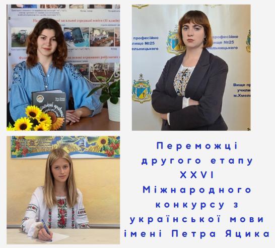 Другий етап ХХVІ Міжнародного конкурсу з української мови імені Петра Яцика приніс ВПУ №25 м. Хмельницького вагоме досягнення — відзначення роботи нашої студентки Яни Щебетюк. Цьогоріч у змаганні взяли участь представники 22 закладів професійної освіти Хмельницької області. Конкурс мав на меті підтримку розвитку української мови, утвердження її престижу та заохочення молоді до мовних звершень. З огляду на умови воєнного стану захід проводився в онлайн-форматі з дотриманням вимог безпеки. Учасники виконували тестові завдання на платформі Test Pad та писали есе на тему: «Немає багатства над тілесне здоров’я і немає щастя над сердечну радість».