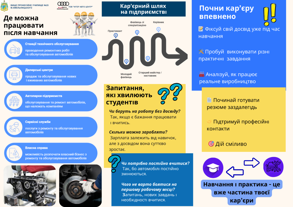 У межах реалізації проєкту «Освіта і бізнес разом: кар’єрні можливості для успішного старту молоді» (програма «InConnect 2) підготовлено онлайн-дайджест «Кар’єрний старт» – практичний гід для здобувачів освіти, які навчаються за професією «Слюсар з ремонту колісних транспортних засобів».