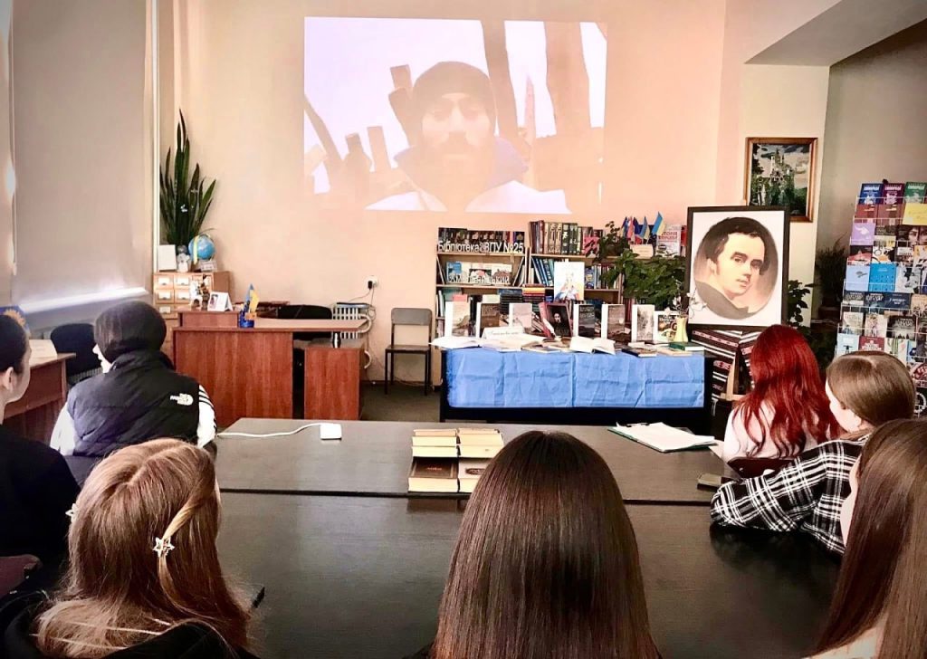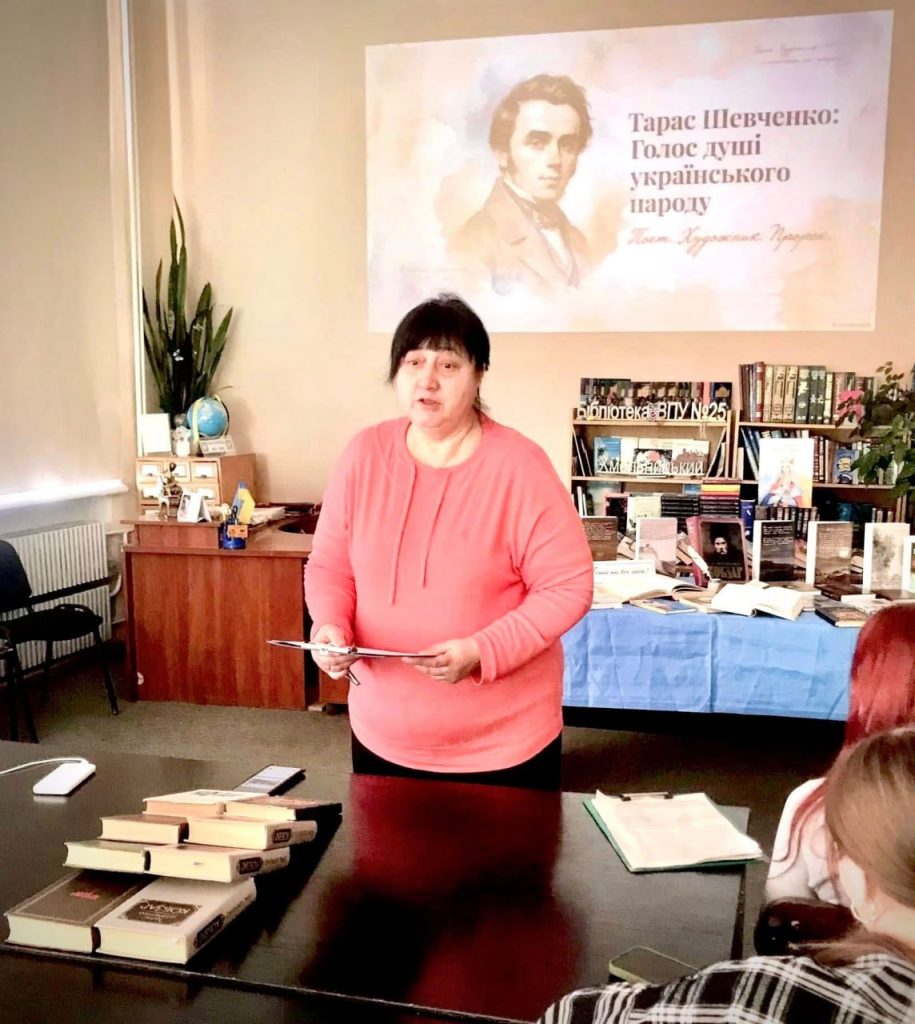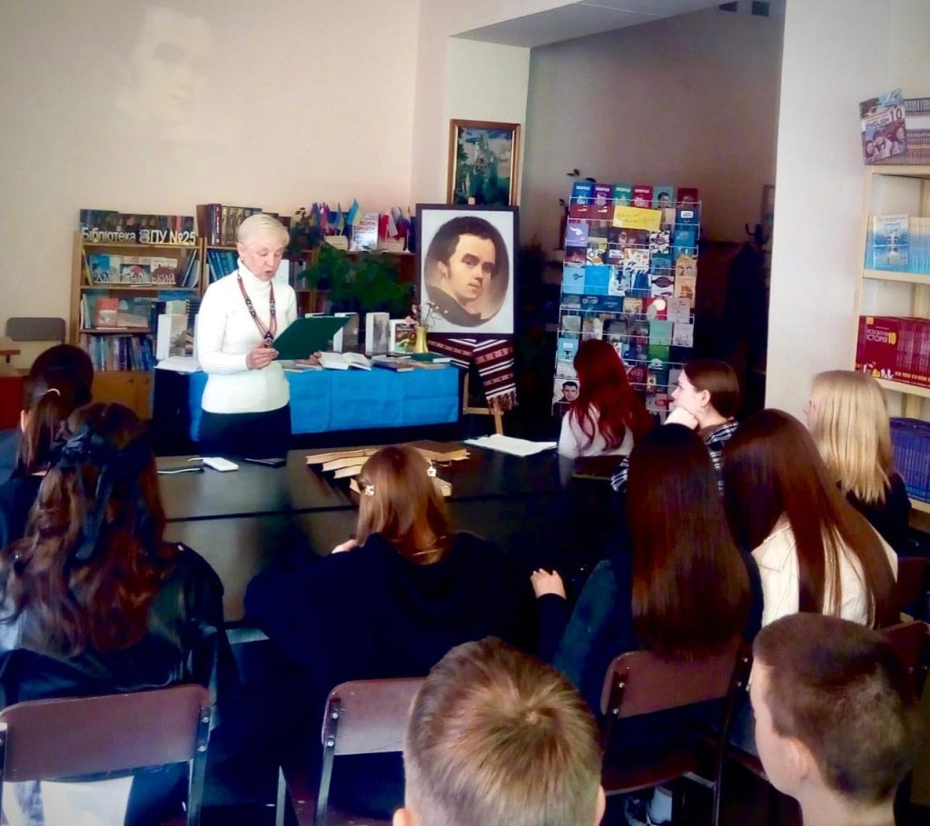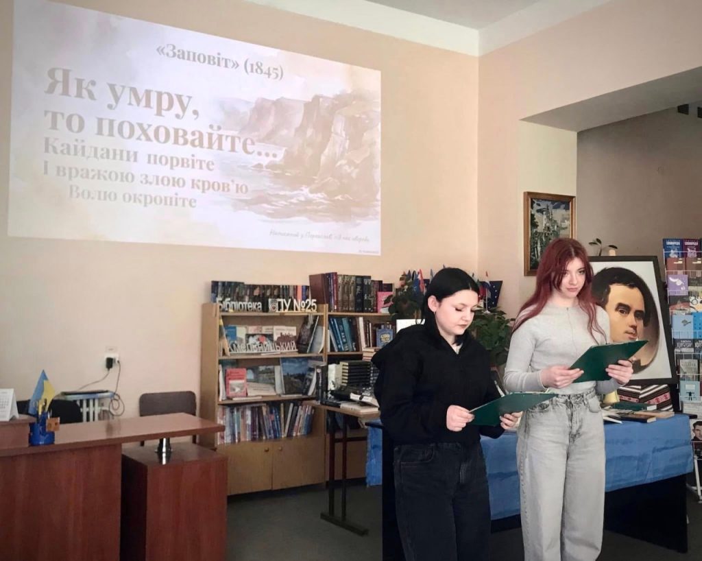 До дня народження Тараса Григоровича Шевченка у бібліотеці Вище професійне училище №25 м. Хмельницького відбувся виховний захід для здобувачів освіти — мешканців гуртожитку, присвячений постаті Великого Кобзаря. Під час заходу, що проходив у форматі своєрідного «діалогу поколінь», учасники говорили про багатогранність особистості Тараса Шевченка — поета, художника, мислителя та незламного борця за правду і свободу. Його творчість і сьогодні залишається актуальною, адже порушені митцем теми свободи, людської гідності та любові до Батьківщини продовжують відгукуватися в сучасному українському суспільстві. Керівник гуртка національно-патріотичного виховання Олексій Радецький ознайомив присутніх із маловідомими сторінками життя Тараса Шевченка, розкривши окремі аспекти його життєвого шляху та творчої діяльності. Бібліотекар закладу освіти Людмила Романова звернула увагу на особливу емоційність і художню глибину інтимної лірики поета, а вихователь гуртожитку Зоя Сова представила сучасні підходи до осмислення та популяризації творчої спадщини Кобзаря. Під час заходу учасники декламували улюблені поезії Тараса Шевченка, а також переглянули відео «Борітеся — поборете, вам Бог помагає!», створене з використанням технологій штучного інтелекту. Творча спадщина Тараса Шевченка залишається важливим духовним орієнтиром для українського суспільства, символом незламності, свободи та глибокої любові до України, продовжуючи надихати нові покоління.