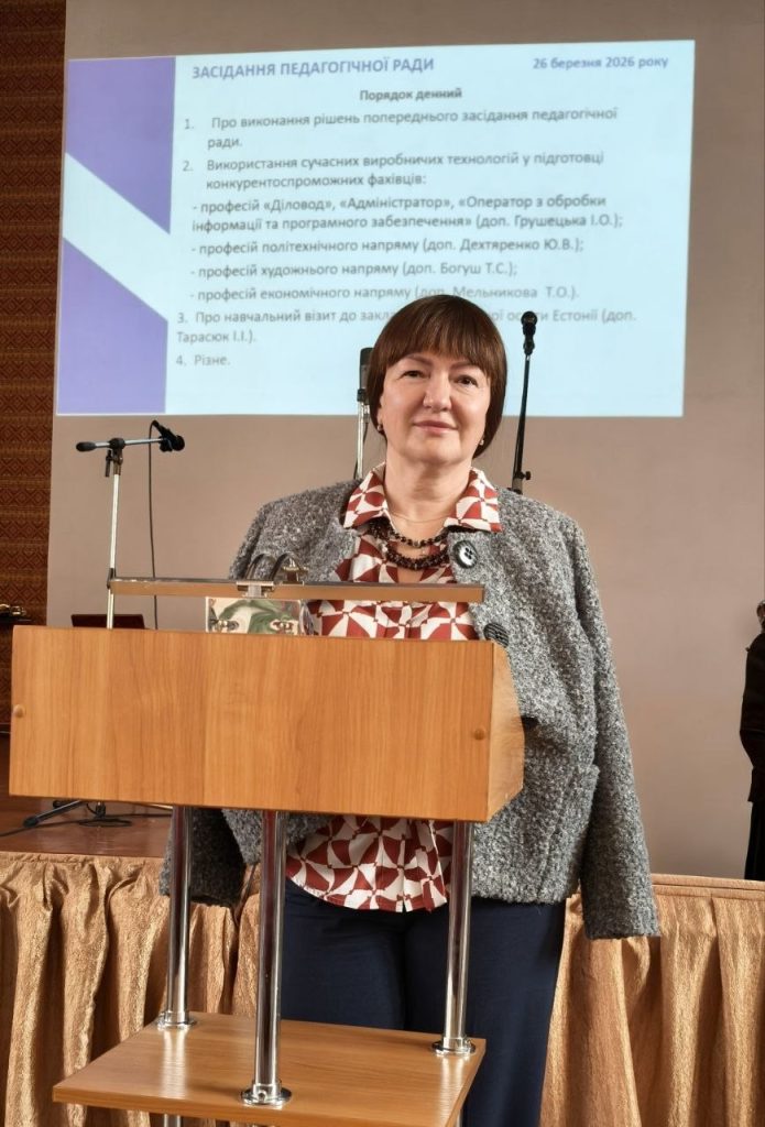 26 березня 2026 року у ВПУ №25 м. Хмельницького відбулося чергове засідання педагогічної ради. У центрі уваги учасників засідання було питання впровадження сучасних виробничих технологій у підготовку майбутніх фахівців професій «Діловод», «Адміністратор» (доповідач – Інна Грушецька), «Оператор з обробки інформації та програмного забезпечення» (доповідач – Дмитро Петришин), професій політехнічного напряму (доповідач – Юрій Дехтяренко), художнього напряму (доповідач – Тетяна Богуш) та економічного напряму (доповідач – Тетяна Мельникова). У ході обговорення акцентовано увагу на необхідності актуалізації змісту освітніх програм відповідно до вимог ринку праці, оновленні навчально-матеріальної бази, посиленні співпраці з роботодавцями, цифровізації освітнього процесу, розвитку фахової компетентності педагогів. Окремим питанням порядку денного став звіт про навчальний візит до закладів професійної освіти Естонії (доповідач — Іванна Тарасюк). Учасники засідання ознайомилися з кращими європейськими практиками організації професійної освіти. За результатами засідання педагогічної ради визначено подальші кроки щодо вдосконалення освітнього процесу з метою підвищення якості підготовки фахівців.
